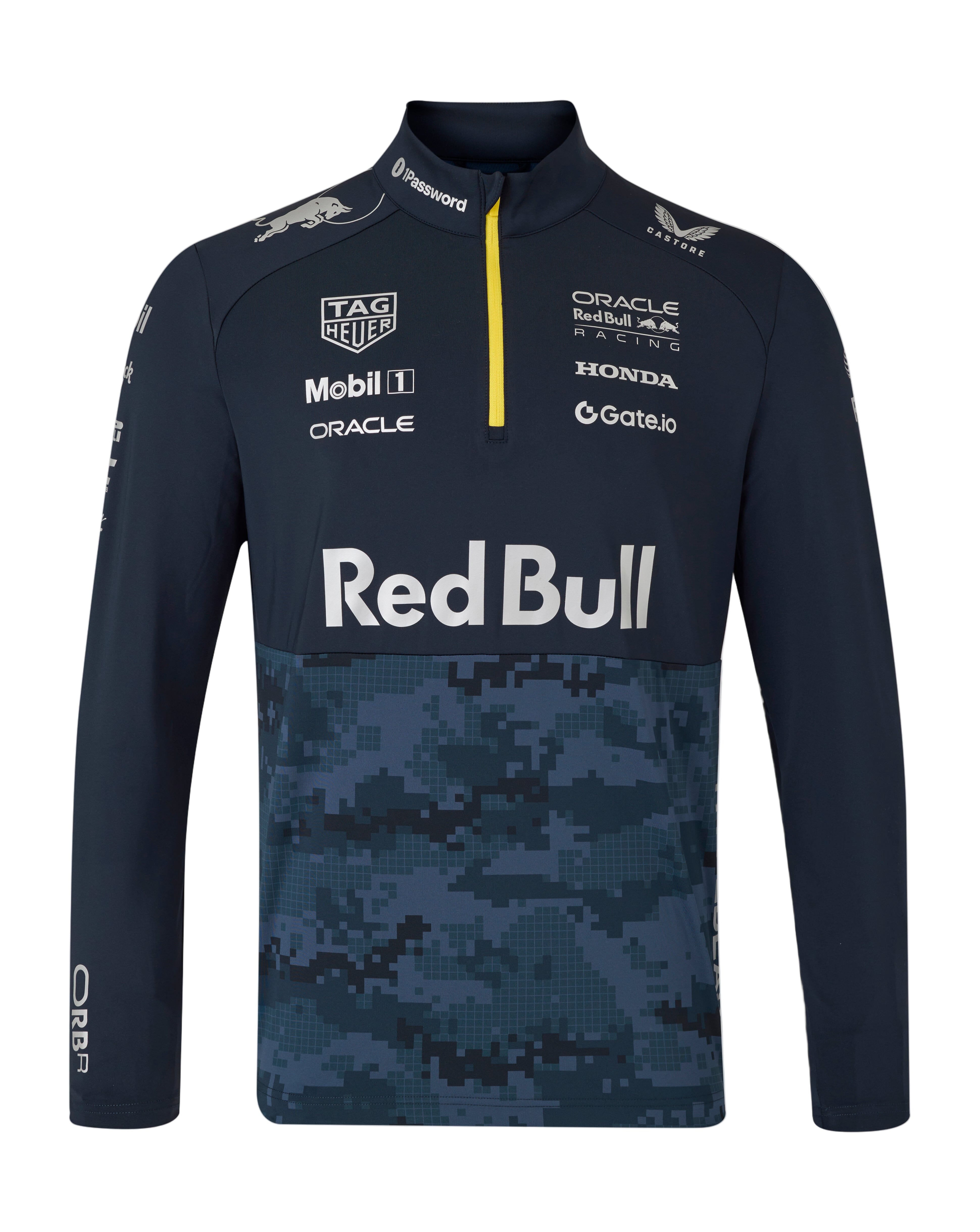Crafted in deep navy with digital camo detailing, bold Red Bull branding, and a sleek yellow zip accent, it’s a piece that turns the paddock into your runway. Lightweight, breathable, and designed with a modern athletic fit, it’s perfect for race day or everyday flex.
